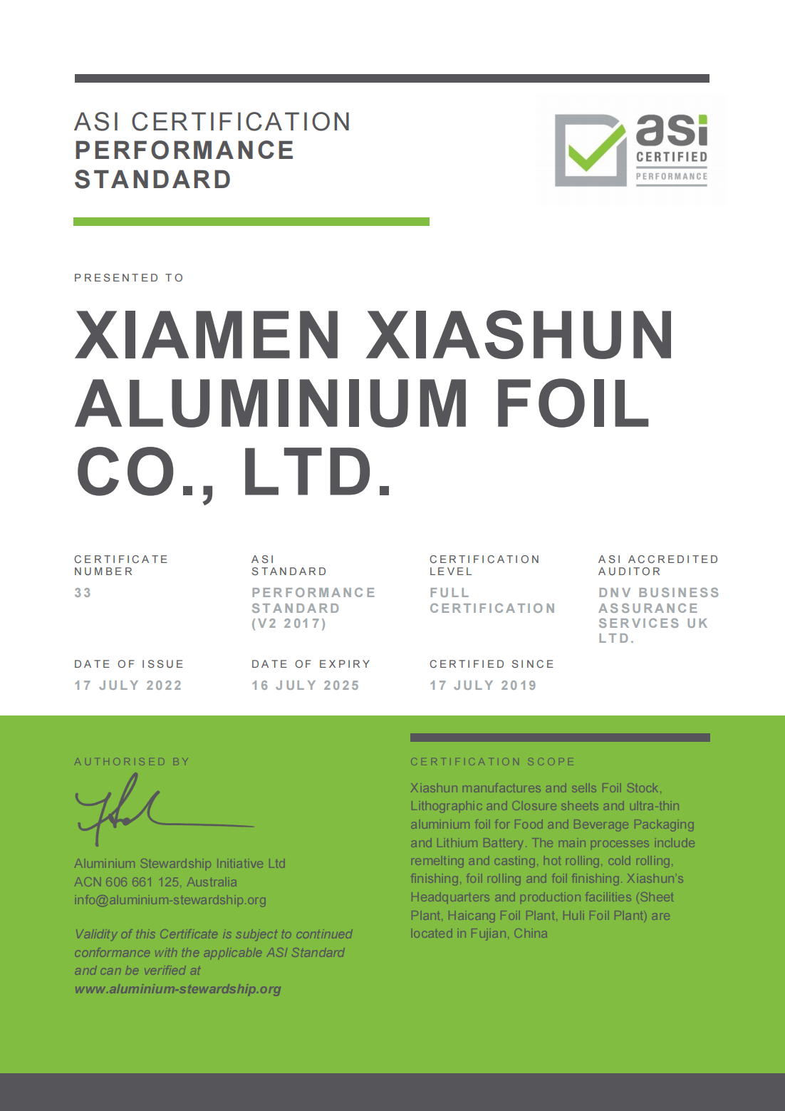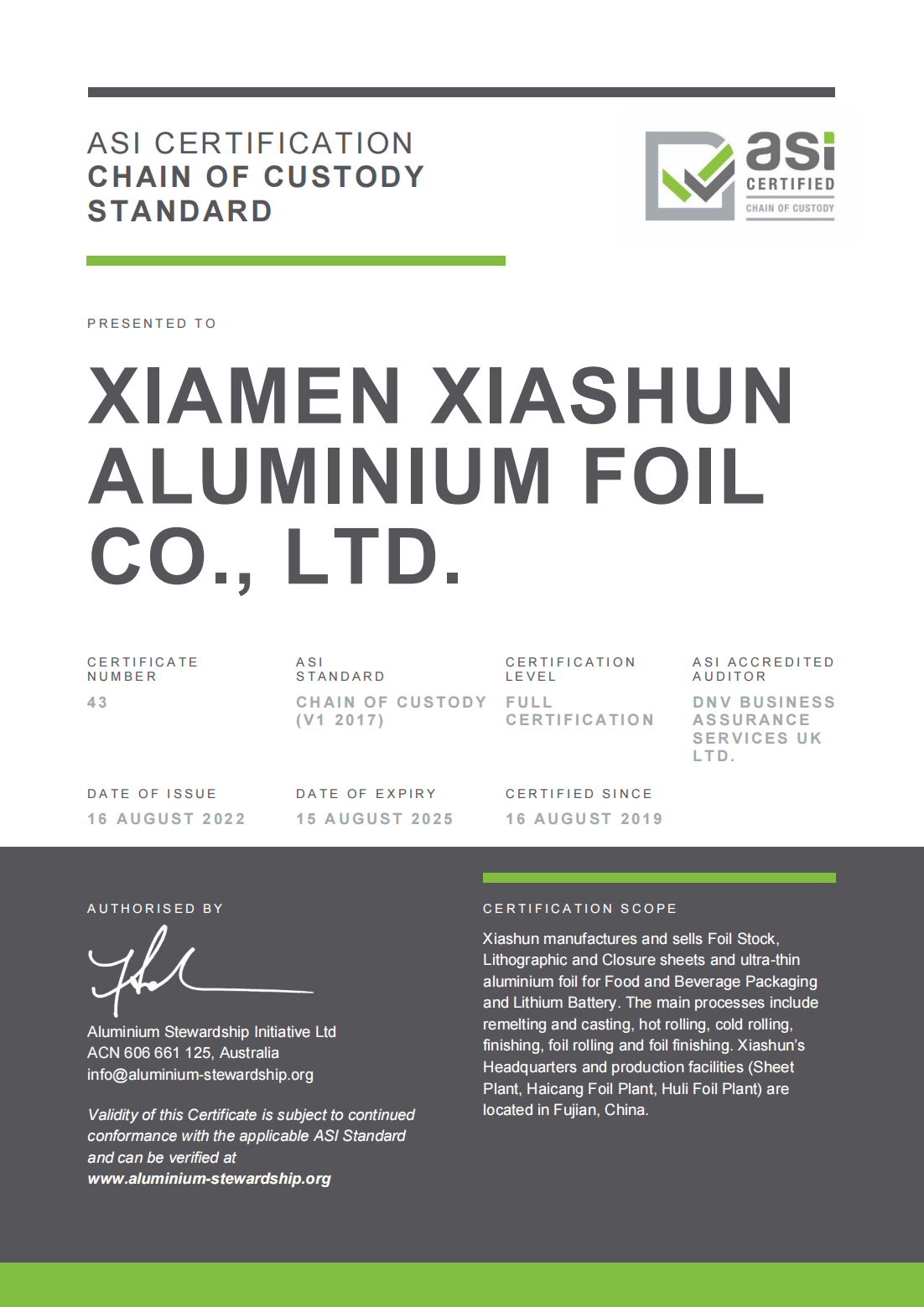 大力推行ASI/CoC鋁價值鏈全球標準,促進鋁產(chǎn)業(yè)鏈對社會貢獻的可持續(xù)性發(fā)展,是中國第二家通過ASI鋁業(yè)管理倡議績效(PS)及監(jiān)管鏈(COC)標準管理體系的企業(yè)。